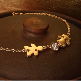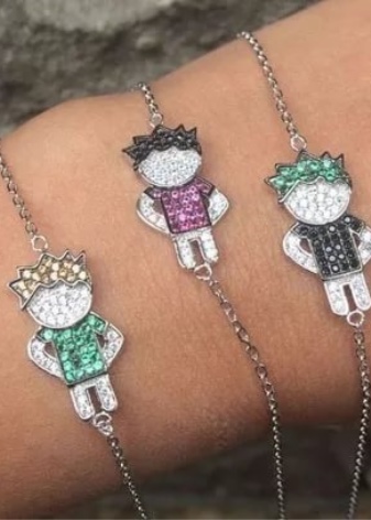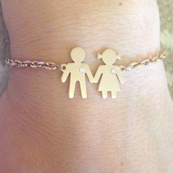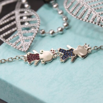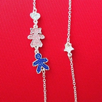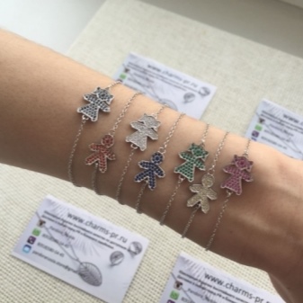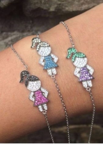 The figures themselves differ, as well as their design. They can be made without crystals, have different hairstyles and hats, uniforms and clothes. These are figures of boys and girls who are selected taking into account who was born in the family. Depending on the number of children in the family, the bracelet can be with one, two, three figures.