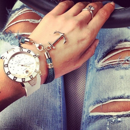 At the peak of popularity are charming bracelets decorated with interesting pendants in the form of an anchor. They look great on a woman’s hand.