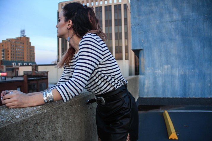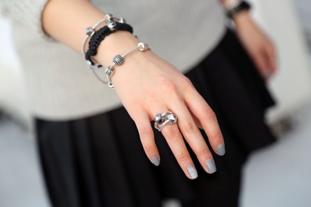 On one hand you can wear several thin bracelets at once, on which silver is combined with another material or pendants. The ensemble complements the original ring, matched to the color of silver. A casual look from a sweater, a short skirt and pantyhose is designed in harmonious black and gray.