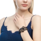 The brand produces inexpensive leather baubles with silver clasps, large precious metal bracelets inlaid with stones.