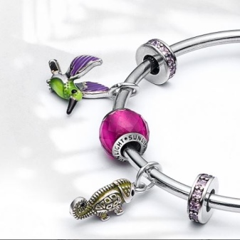 Charms pendants are diverse: decorative figures made of silver, enamel round charms with topazes or cubic zirconias. In addition, there are elements decorated with sapphires, amethysts, agates.