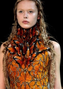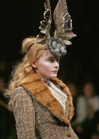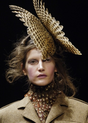 In the collection, McQueen used mainly polysyllabic textured fabrics, tartan, feathers and fur. The headdresses were played by antlers, nests, wings of butterflies and birds. The show ended with a hovering hologram of Kate Moss in a weightless organza dress.