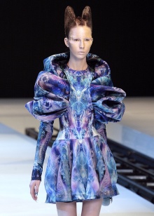 The collection includes airy dresses, outfits of an unusual shape with a snake print and an image of iridescent butterfly wings. On the head of the models were high hairstyles that were designed to complete the image of alien creatures.