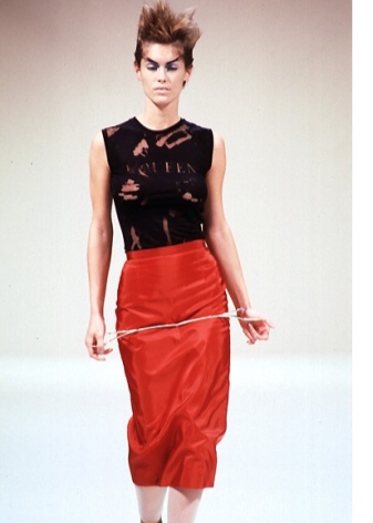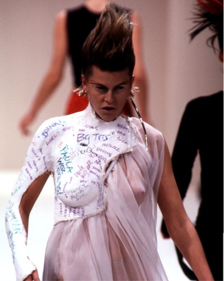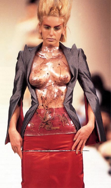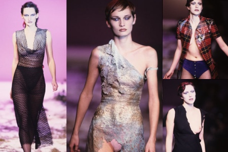 The collection praised the beauty of vampires before it became mainstream. In the mid-90s, the designer used tops resembling blood bags, asymmetrical black silk blouses and trousers with cutouts on the hips.