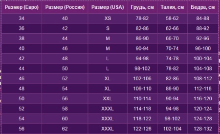 The table of the company presents the sizes of women's clothing from 40 to 62. The approximate sizes of the chest, waist and hips in centimeters are indicated. A convenient table, as well as correctly performed measurements, will help a woman not to make a mistake in choosing and order exactly the model that will look perfect on her figure.