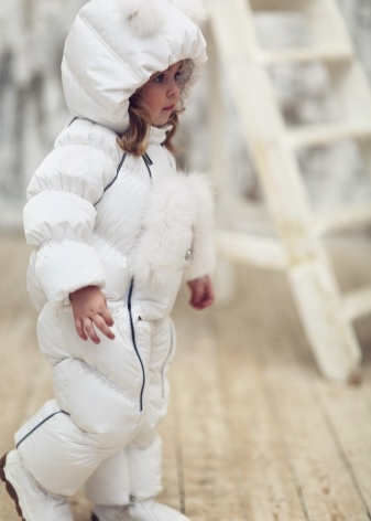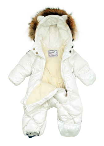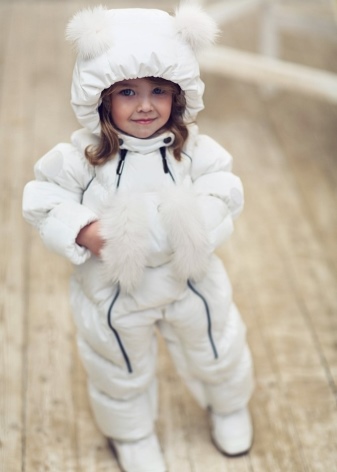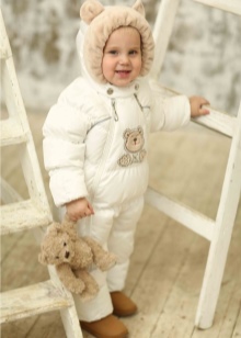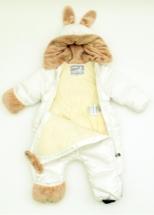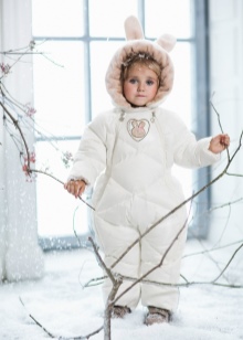 The model also includes mittens and booties. The baby's chest has additional protection against wind and frost. The hood is complemented by stylish fur ears that can be unfastened if desired. A distinctive feature of this model is the quilted texture. This transformer jumpsuit is presented in snow-white color.