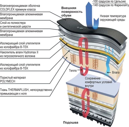 - For the manufacture of the upper part of insulated pairs, completely different components are used. It all depends on the purpose of the products. For example, for the popular Conviction line, quality leather with silicone is used. Shoes from the Power-sport collection are suitable for lovers of snowmobiles or ATVs and are made from the most durable leatherette, complemented by carbon details.