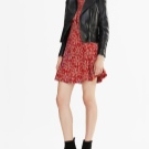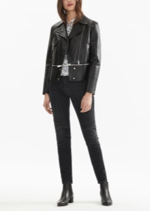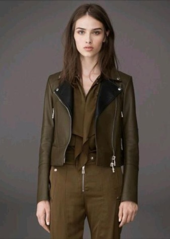 - A cropped leather jacket with a stand-up collar.