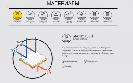 For the best protection against cold and wind, the products use a special Thermal Mapping technology: the fluff is distributed and fixed in specially stitched cells throughout the product, interacts with the fabric as much as possible for the best heat preservation.
