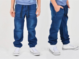 The most popular denim option is jeans. Options for the execution of this model of denim trousers for babies are different from the options for older children. For the smallest, a lightweight model has been developed, in the belt there is an elastic braid with a kiper ribbon, the lower part of the leg or gathered on an elastic band or cuffs are sewn. For older children, models of straight cut with a stitched belt in which an adjustable elastic braid is sewn.