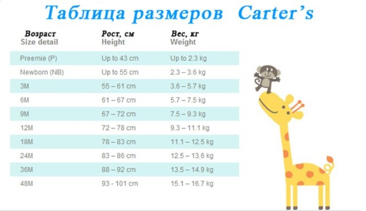 Brand sizes up to two years are determined by month, followed by a difference by year. Since children may not meet the parameters with their height and weight, Carter’s provides detailed information with an orientation to their parameters, which are slightly smaller than Russian ones. Therefore, for a large three-month-old baby it will be more expedient to order things a size larger in order to carry clothes longer.