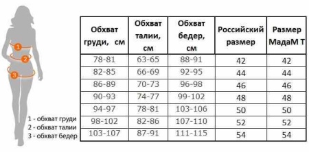 Ladies only need to purchase an outfit that would be perfect in size. Each stylish Madame T model is presented in sizes from 38 to 64. This means that a lady with any complexion will be able to find harmonious and attractive clothes.