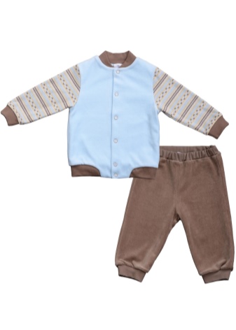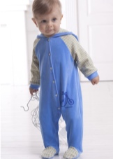 - Velor jumpsuit with a hood and buttons. It is decorated with a pattern inside the hood, on socks and sleeves. A white cotton fabric is used as a lining.