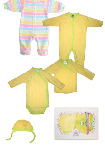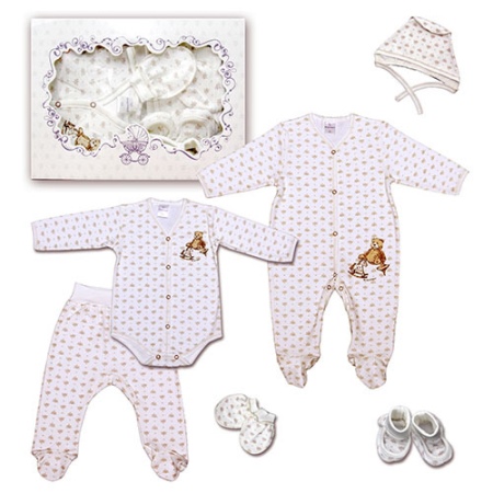 Gift sets called Ecru Toys deserve special attention.. They include everything you need for a newborn. The complex includes booties, scratches, a bonnet, romper, long-sleeved bodysuit and jumpsuit. All clothes are made of quality material that allows air to pass through and retains heat. Jumpsuit and body have buttons for easy donning.