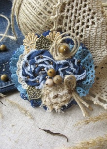 Denim models look best in combination with denim. Wear at least one denim and an interesting casual look is guaranteed. As for knitted brooches, they can be combined with sweaters, knitted tunics, cardigans, woolen dresses. Such a brooch on a handmade knitted openwork hat looks very tender.