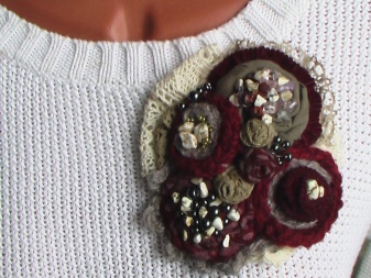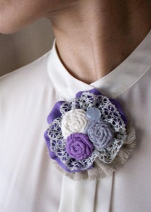 If you know how to crochet well, and you like to create beautiful jewelry in this way, it will not be difficult to make a brooch. There are two options - crochet to make several circles and sew them on top of each other. Having done this, you can decorate products with small figures or beads. It will turn out a very cute knitted brooch that fits well with woolen fabrics.