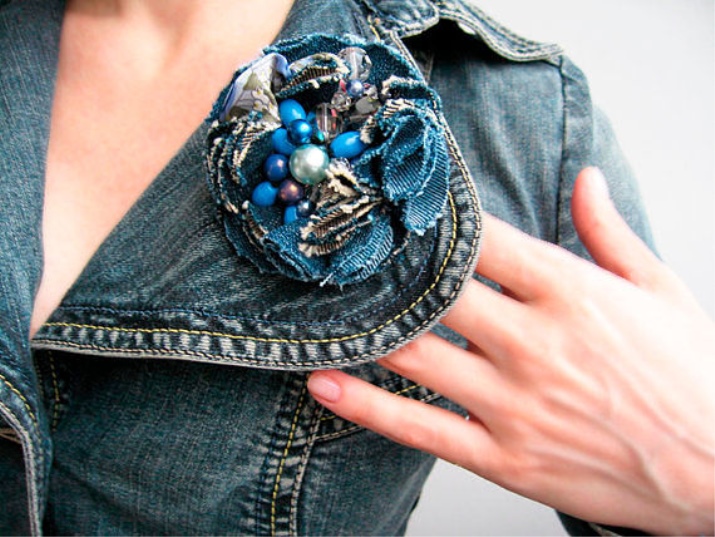 Especially cute look brooches in the shape of a rose, decorated with stones and beads. The simplest ones you can try to do yourself - for this you need only a little denim and decor. Beautifully drape the material by applying one layer to another to form a flower. After that, it remains only to beautifully decorate with small elements and rhinestones.