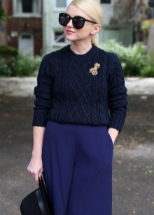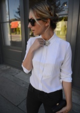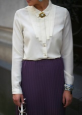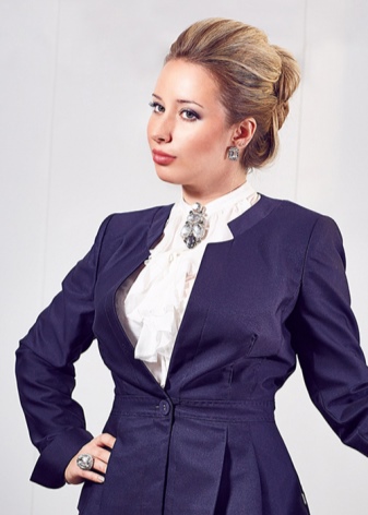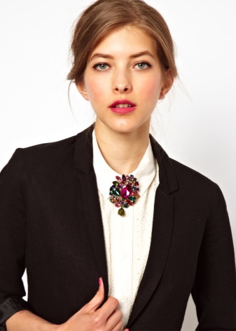 The versatility of the accessory allows you to wear it with business kits. To do this, it is better to purchase a miniature brooch in a restrained design. Precious and semi-precious stones on the product must be made in soothing colors. Such products will look great on strict trouser suits and office ensembles of shirts and skirts.