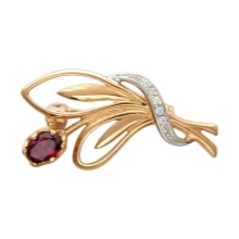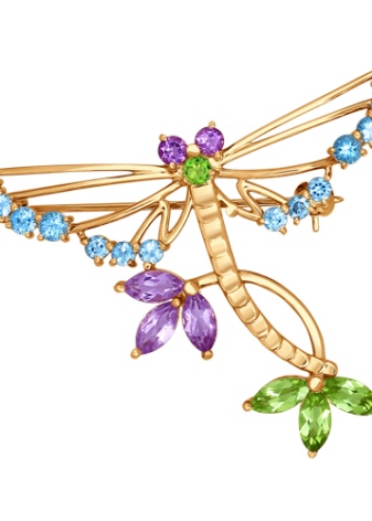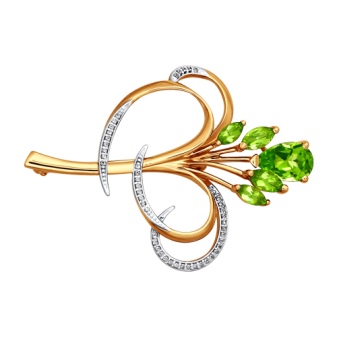 - Gold brooches with emerald, cubic zirconias, sapphire, chrysolite, pomegranate, turquoise, amber, ruby, topaz, amethyst, pearls and other precious stones look especially bright and luxurious.