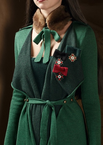 Rounded brooches will harmonize with neat and flowing lines in clothing. It can be various ruffles, lace or shuttlecocks.