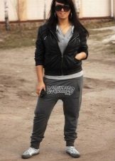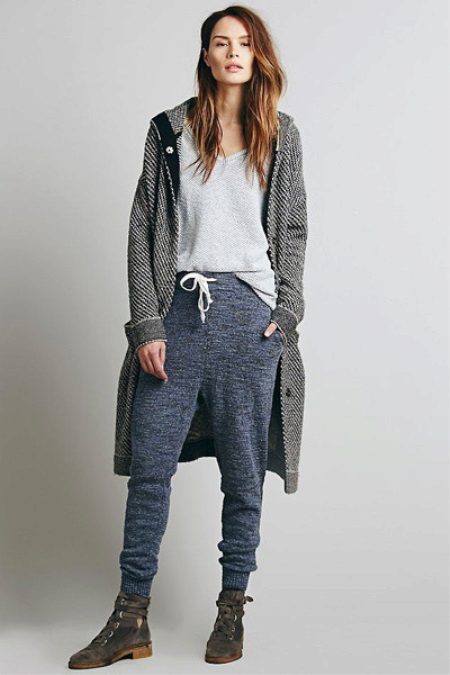 Sporty style: afghani made in the form of sweatpants, a thin sweatshirt, a long cardigan and comfortable boots - all in monochrome, gray tones.