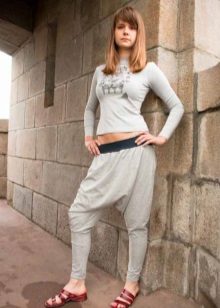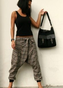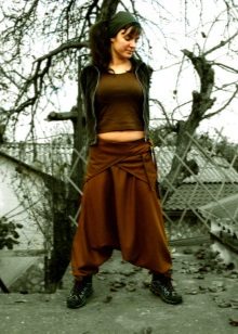 Afghani trousers go well with things that have an oriental touch, for example, with tight-fitting short tops, bright sandals with lifted noses, massive jewelry. However, these are far from the only possible combinations.
