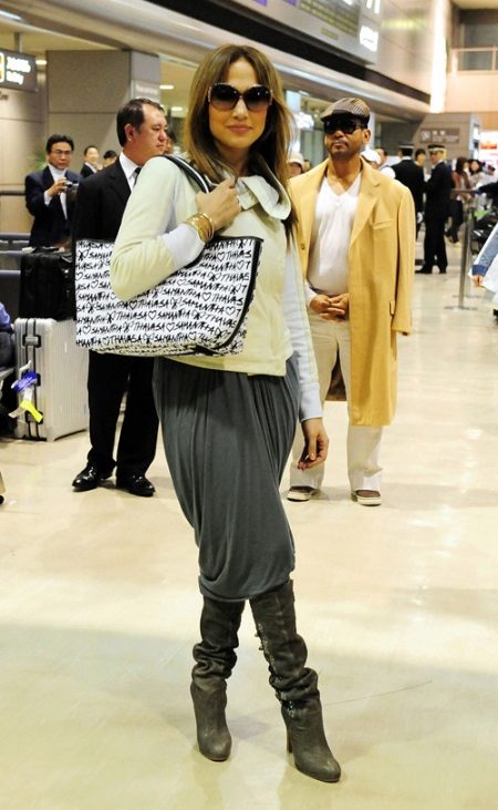 Star image: gray afghani with drapery along the entire length, tucked into high boots, are effectively combined with a short white jacket. Large details complete the look: a capacious bag and sunglasses.