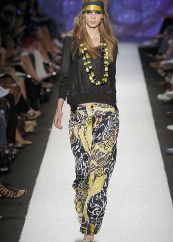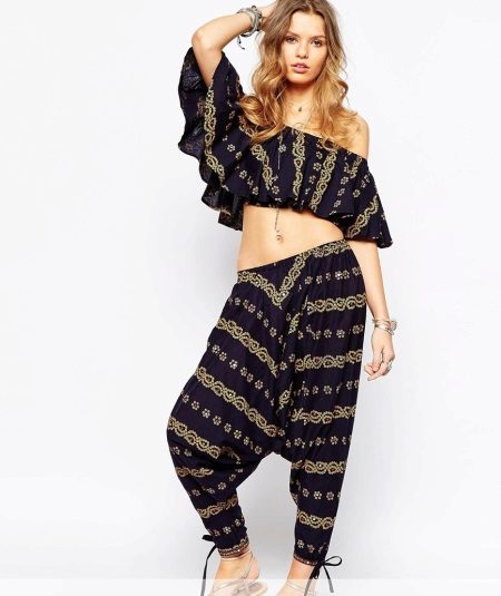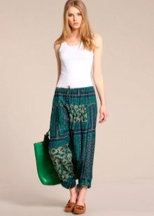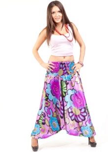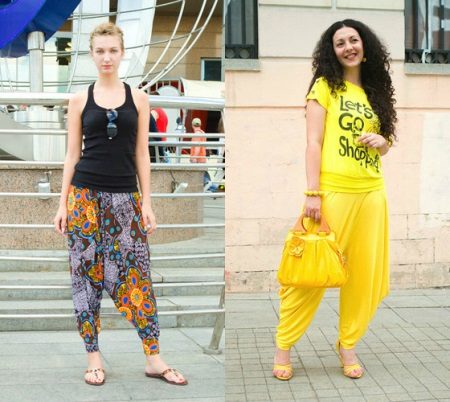 Trousers can be plain and bright colors. Particularly popular are models of bright contrasting colors, as well as ethnic or oriental prints. The most popular are floral, geometric.