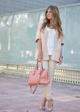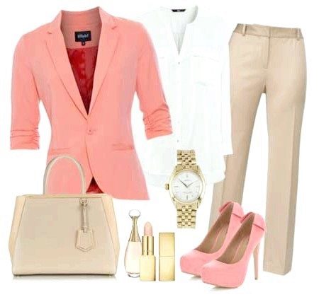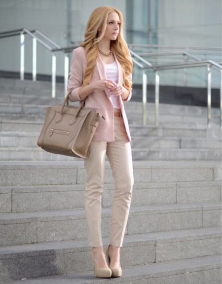 The beige color of trousers looks very tender in combination with the pink color of outerwear, for example, if you choose a white shirt for beige trousers, and choose shoes and a jacket in one of the shades of pink.