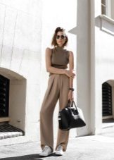 In everyday ensembles, the choice of blouses, shirts and tops is practically unlimited. If the trousers are light, a plain t-shirt and a print t-shirt will look good with them. Tunics, cropped tops, sleeveless blouses, denim shirts, light sweaters, jumpers and long sleeves - any of these options has the right to life in combination with beige trousers.