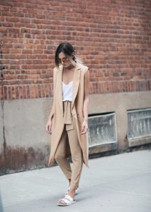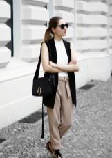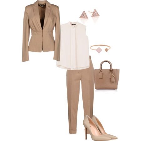 A successful office bow can be created completely in beige color if you wear a light beige sleek sleeveless blouse and a jacket that matches the trousers, picking up beige pumps with low heels and discreet accessories.