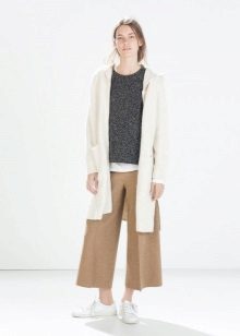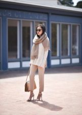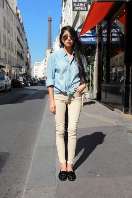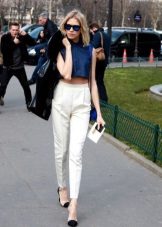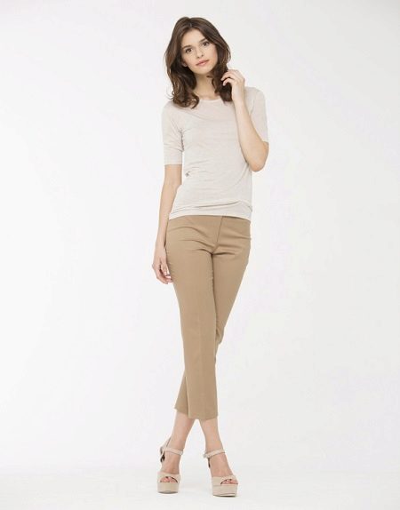 Narrow trousers of a light shade look attractive with brighter tunics, for example, green or brown. A striking choice for such trousers would be a striped top, in which the stripes will be black and white or blue and white. If you want to create a calm, discreet look, choose a light beige or white top for similar trousers.
