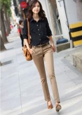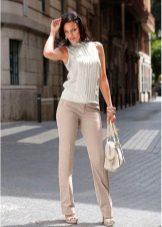 For images that use strict beige trousers, a shirt or blouse should also be strict. Most often this is a plain light clothing, for example, white or light beige. Business ensembles can also be created with a turtleneck or plain top.