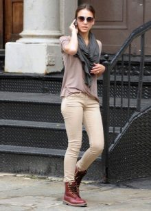 In cool weather, skinny beige trousers look good with chelsea boots or high boots. A good choice for beige jeans are broggs, loafers, sneakers, moccasins and ballet shoes. In the summer, light beige trousers go well with sandals both on the heel and on low speed.