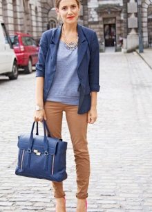 The ensemble with beige trousers looks very attractive if you put on a dark blue jacket. The top beneath it may be gray or white.
