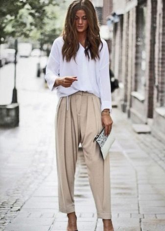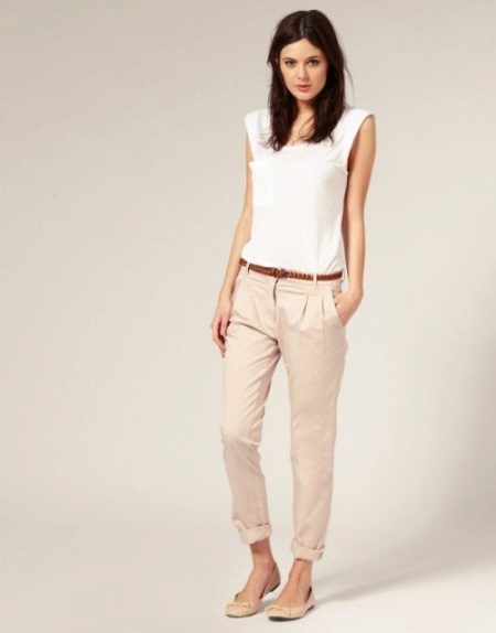 Another laconic, but very attractive version of a casual dress with beige pants can be created with a white top, for example, with a white blouse, complementing the image with beige boats and a brown strap.