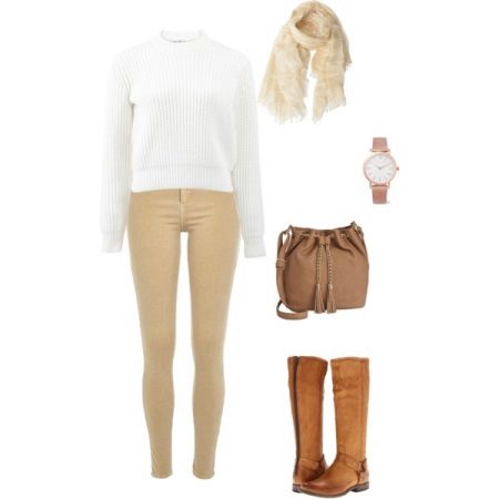 In cool time, add narrow beige trousers with a white sweater and high brown boots. From the accessories, pick up a brown bag and a beige scarf.