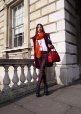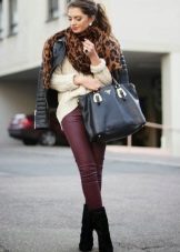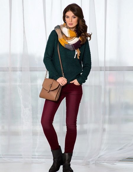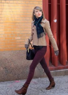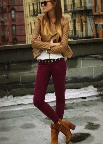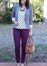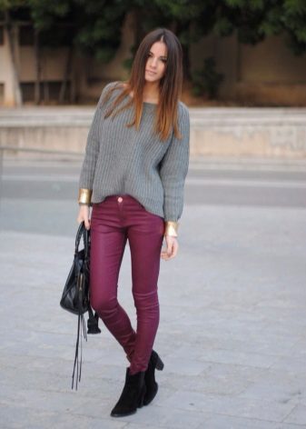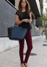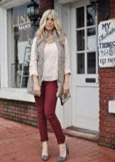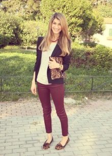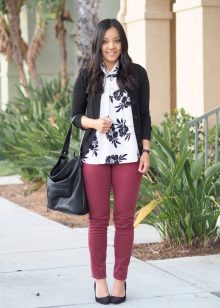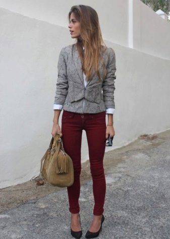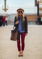 Skinny burgundy jeans or skinny jeans can be worn with basic wardrobe items such as a black jacket, beige or black blouse, striped top, checkered cardigan, leopard print sweatshirt, denim shirt, jackets and coats in beige and monochrome shades. In addition to strips and cages, polka dot elements of outerwear are also well suited. It is better to complement this image with the help of a handbag in a juicy shade or a shiny clutch.