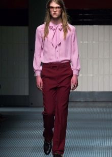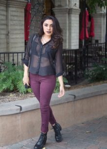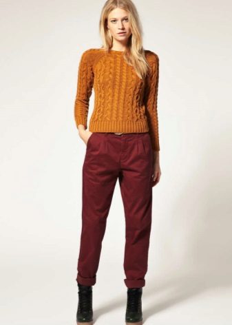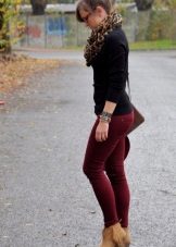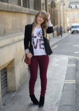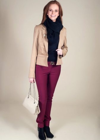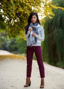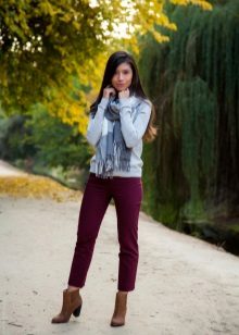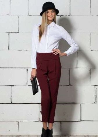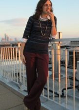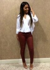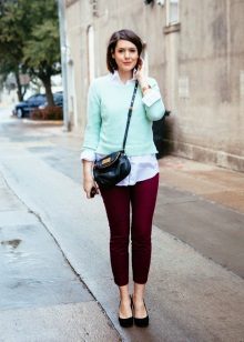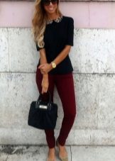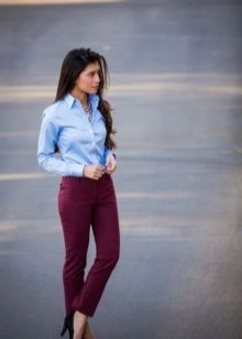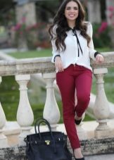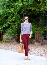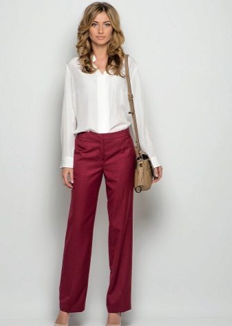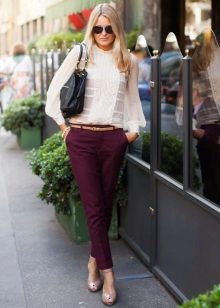 Such a thing as burgundy trousers will go to almost any girl or woman of any build. But nevertheless, such a bright and catchy thing is preferable for girls rather slender and tall. And do not forget about the basic rule of combining things - in one set should not be from two to three colors.