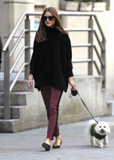 Tall and slender long-legged young ladies will perfectly go with flared burgundy trousers. We advise you to choose a light turtleneck, a thin blouse or a short jacket of a neutral shade. Do not give up on a cozy elongated cardigan of large knitting. To a flared model of burgundy trousers, shoes with flat soles are suitable for walking - shoes or boots.