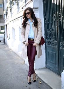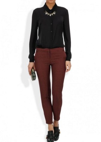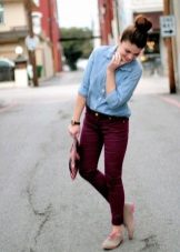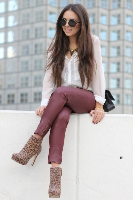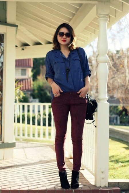 Other elements of the wardrobe should also not contain overly flashy colors and eye-catching prints. It is best that all other clothes are not catchy, calm tones and without the presence of a pattern. Dazzling fabrics and vibrant prints can distract others from your stylish trousers. Accessories should also be chosen in calm colors. For example, put on your burgundy trousers a light blouse with small buttons and shoes in a calm beige shade.