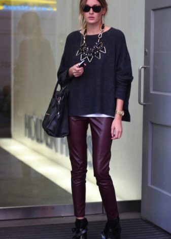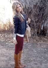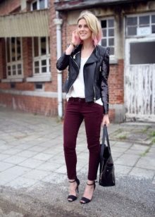 Many girls and women prefer leather things. The combination of burgundy trousers, a white tank, a gray short sweater and a black leather jacket will look pretty stylish. A sweater, as one of the elements of creating a popular multi-layer image, can be excluded if desired. Suitable shoes, for example, stylish black sneakers, complete the fashionable look. A gray handbag will not be superfluous in this ensemble.