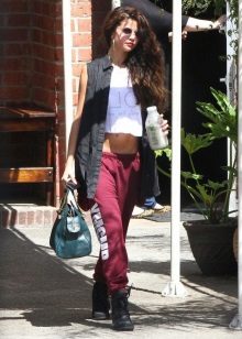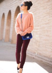To create a business style, classic straight-cut trousers from dense burgundy fabric are the best suited. Casual style is unthinkable without cropped coral trousers that reach about the middle of the calf. It would be wrong not to pay attention to sports trousers of a wine shade, they can be both free and, on the contrary, narrow, have elastic bands or drawstrings on the bottom, complemented by pockets and stripes.