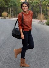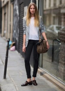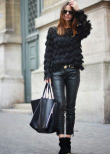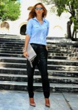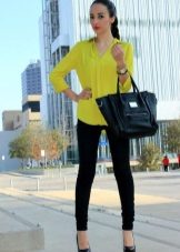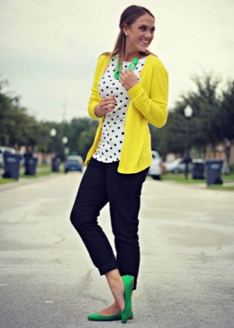Skinny black trousers look great with white shirts, as well as with checkered, polka dot or striped patterns. This model can also be combined with a denim shirt. In the cold season, a voluminous knitted sweater of bright color is suitable. When choosing shoes, you should pay attention to the models of shoes of bright color or to ankle boots with a stable heel made of suede.