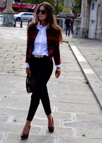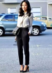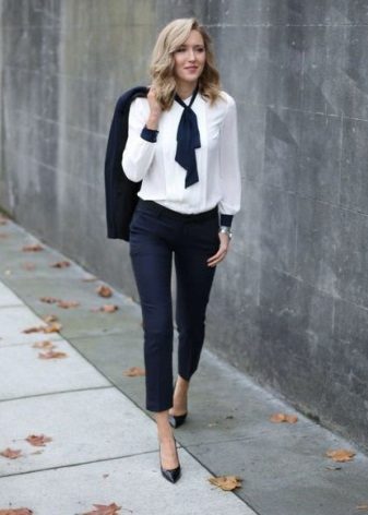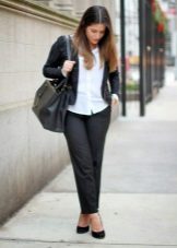 Over a white blouse, you can wear a shortened jacket or jacket, as well as an elongated sleeveless jacket. Dress shoes look stylish with classic trousers. Do not be limited only to black, because they can be blue, red or burgundy. You can choose a handbag to match the tone of shoes.