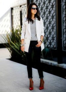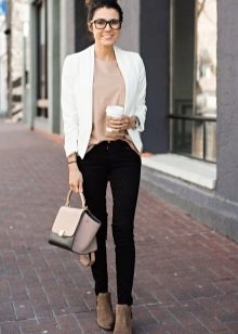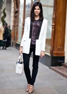 A snow-white jacket looks stylish. This combination is ideal for a business woman, emphasizing her beauty and elegance. To add bright colors, it is enough to use bright accessories to place accents.