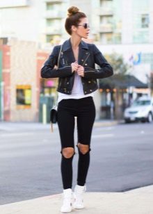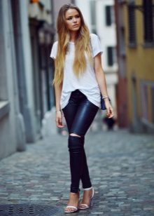 The classic combination of black and white in the embodiment of a stylish bow in casual style is always in trend. Black skinny pants with holes in the lap, combined with a white t-shirt decorated with print, look great in tandem with white heeled sandals, and are complemented by a small bag that matches the trousers on a long thin strap.
