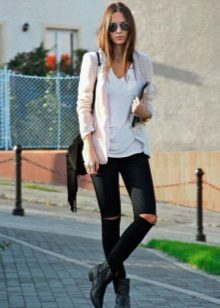 Torn models this season are of great interest. The variety of options is simply mesmerizing, so every girl can choose the perfect option for herself. Pants may have slits above the knee, on the knees, or throughout the trouser leg. This style is liked by young people. It is often found in everyday wardrobe.