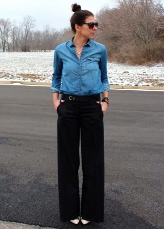 Wide trousers are in trend today, since they will help to embody a unique bow in an office style, you can go on them both for a romantic date or for a gala event. Wide models are suitable for all girls, regardless of the type of figure. The main thing is to choose the right upper, shoes and accessories.