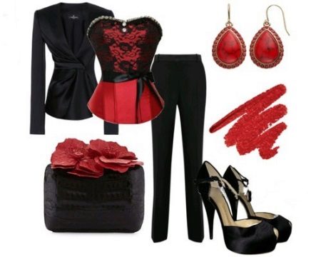 A sophisticated black jacket with an elegant belt at the waist perfectly complements the elegant look. Red jewelry, a clutch matching the trousers, decorated with a red flower, and black stilettos will help to complete the solemn bow.